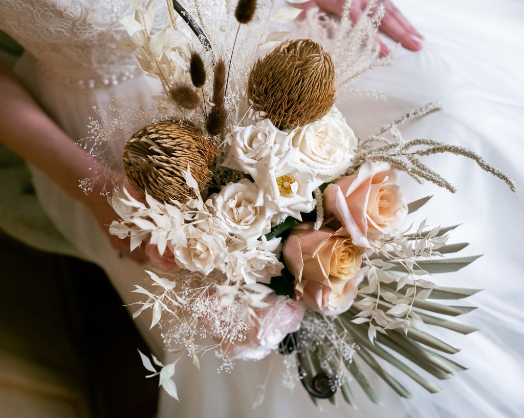 You’ve probably seen them online, and couples are definitely asking for them: dried elements in wedding floral design. From stately and impressive pampas grass plumes to delicate and lacy bleached ruscus, dried botanicals are having their moment in floral trends.