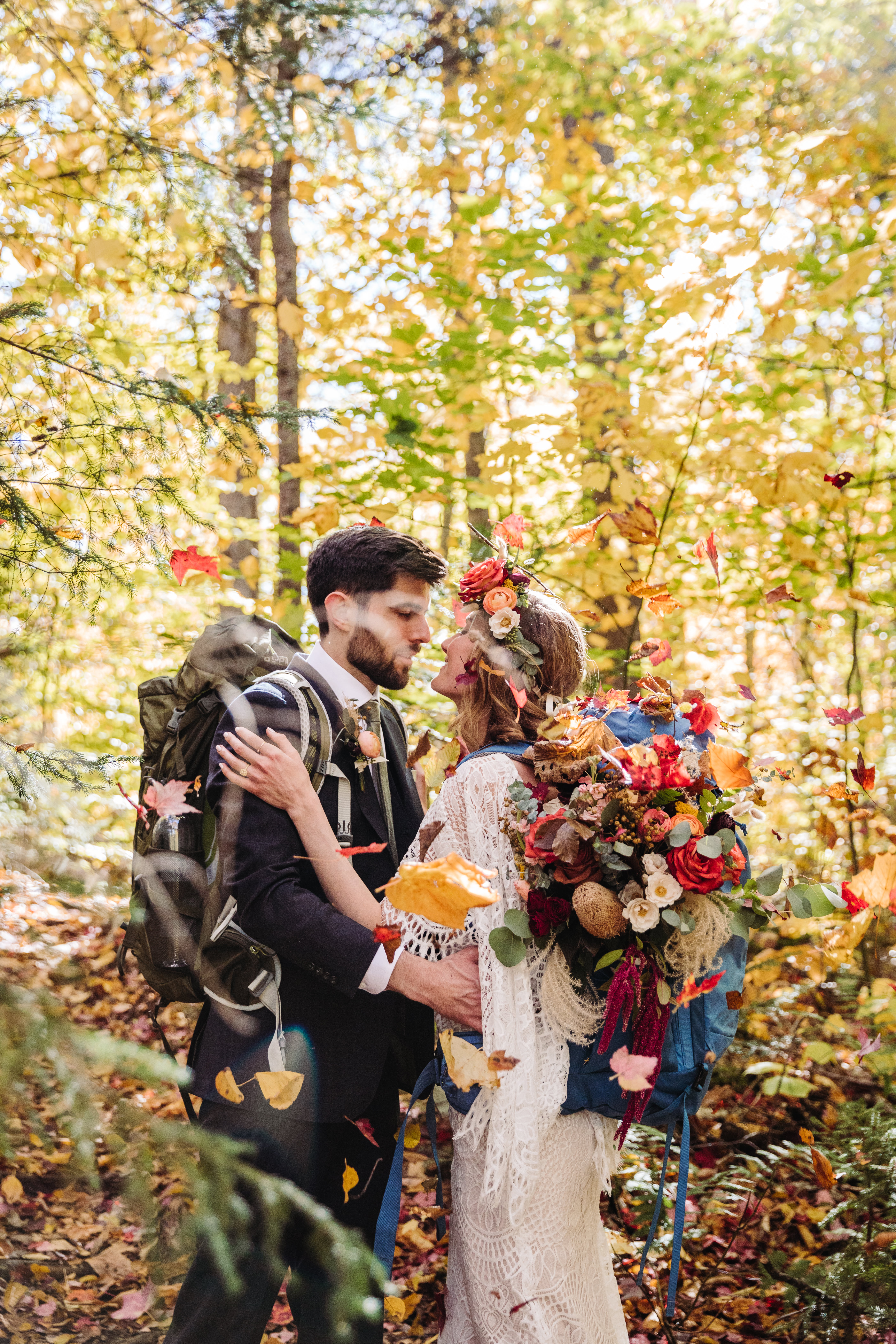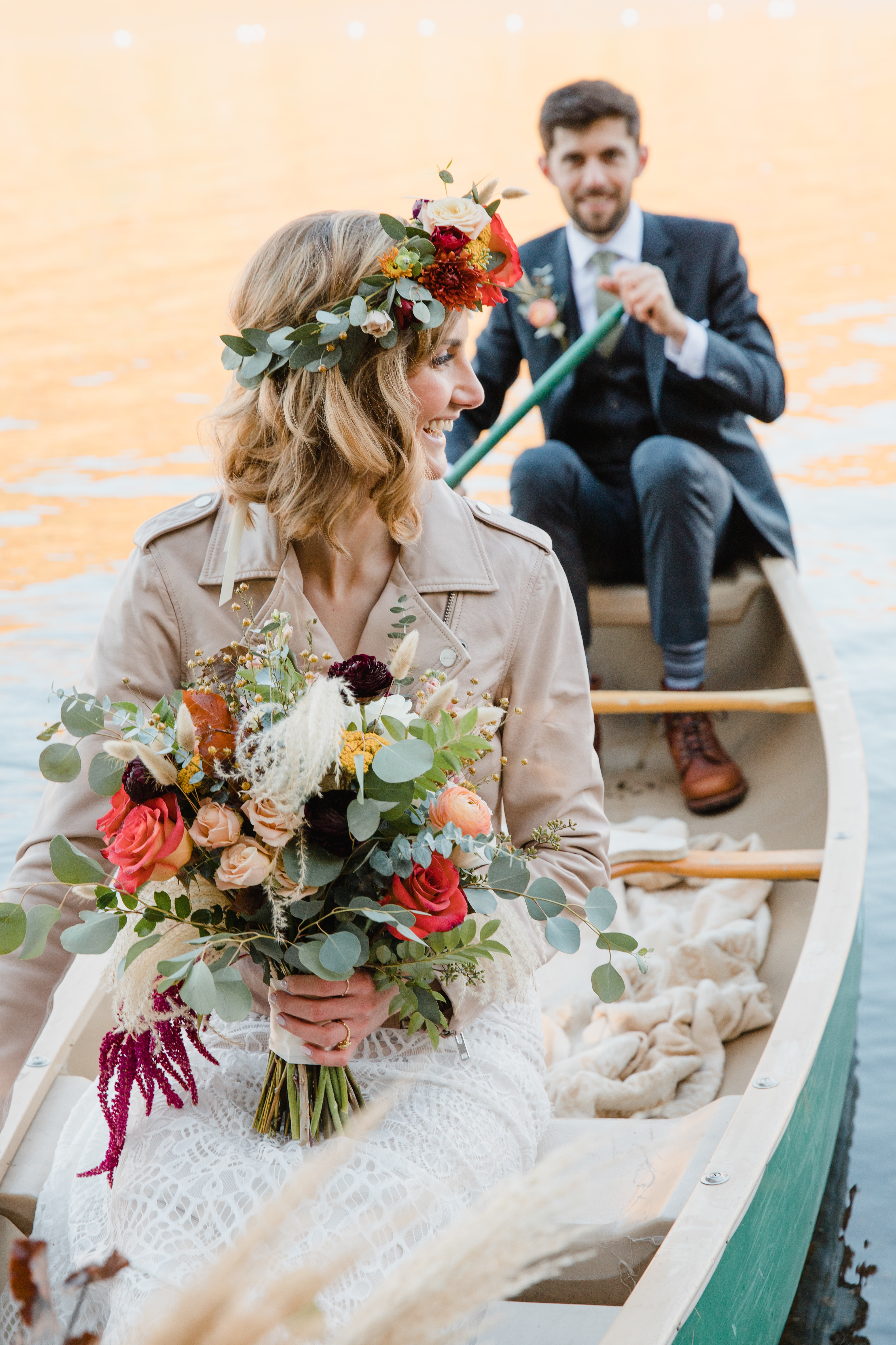 This was a double-duty weekend during the COVID pandemic. The couple opted for a beautiful and private elopement after a hike and canoe in the Adirondacks. The bride’s must have? A dramatic floral crown. The following day, they celebrated with closest family in an intimate secondary wedding celebration.