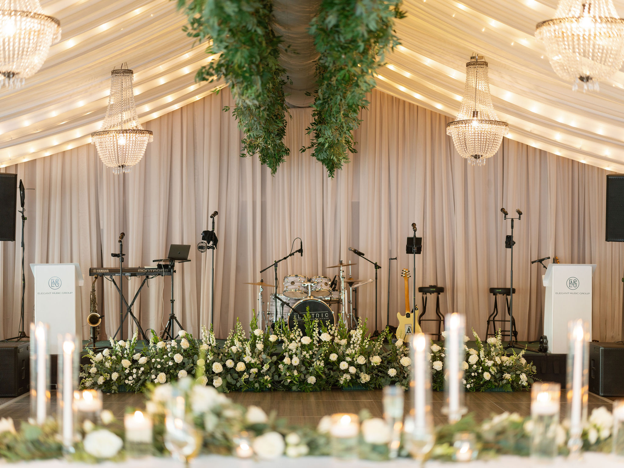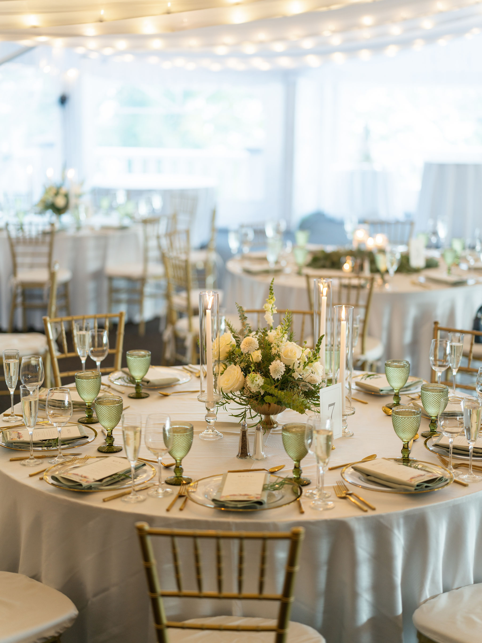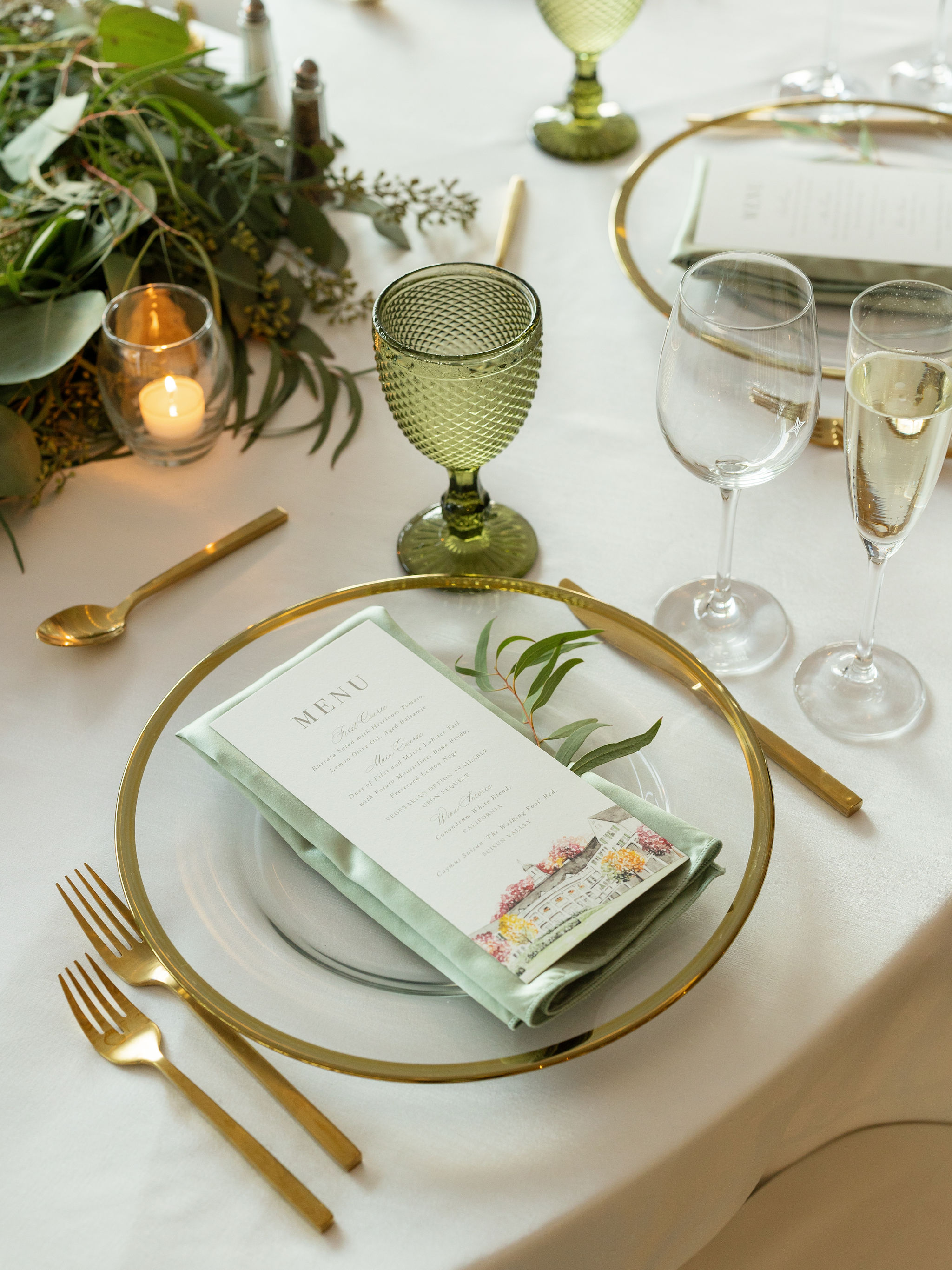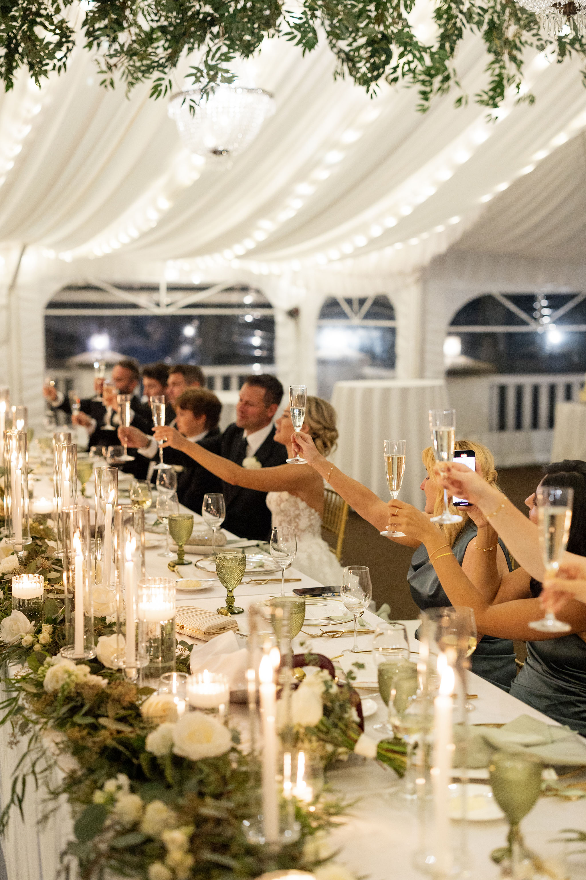 This fall wedding featured abundant sage greens with white for a clean and traditional ambience. The clients opted for a luxuriously draped reception space, with sparkling chandeliers and accents of gold. Sage goblets and gold flatware completed this cohesive look. Ample candlelight and cascading floral and eucalyptus garlands created a dramatic focal point on the head table.