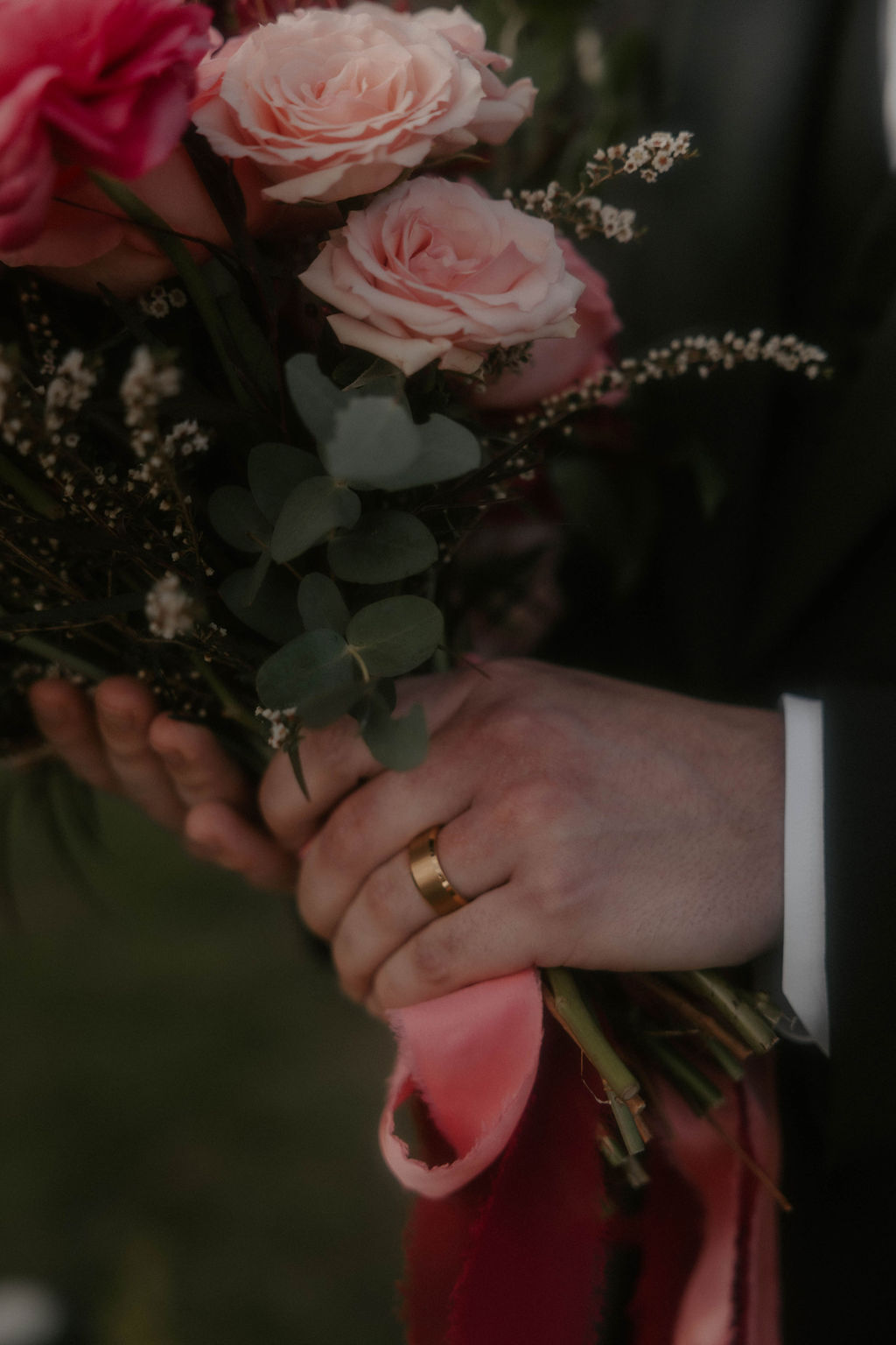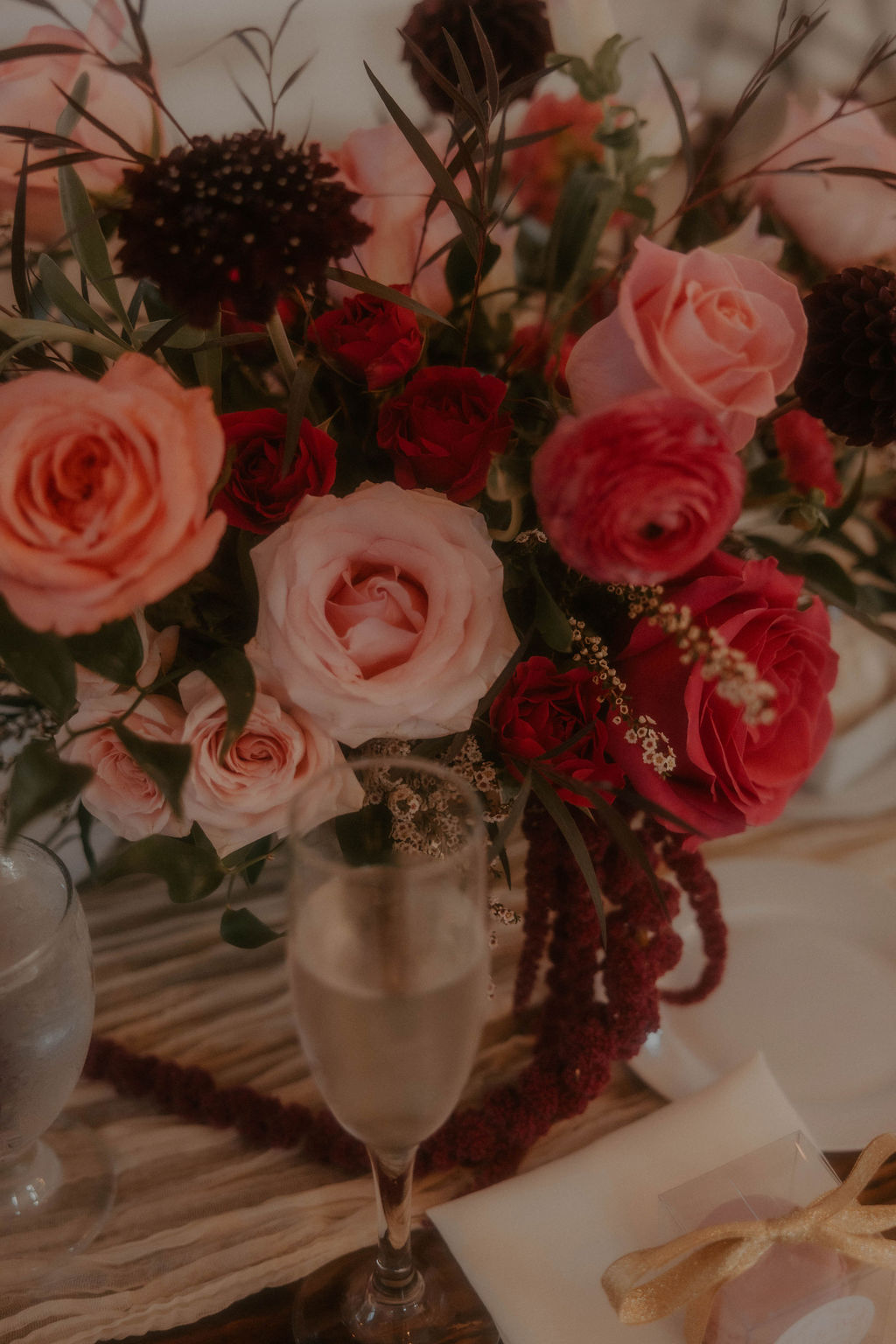 The ultra-romantic palette of deep burgundies, reds, and pinks coordinated perfectly with the venue’s blushing hydrangeas for this late September wedding in the Adirondacks. A combination of garden roses, dahlias, ranunculus, and hanging burgundy amaranthus lent a luxe but ethereal mood to the day.